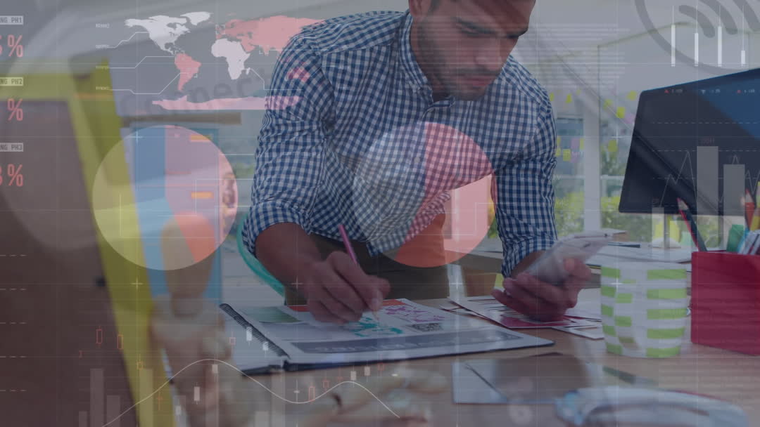 Young professional in office hunched over desk studying financial documents and graphs on tablet while using smartphone. Background shows overlay of global charts and data analytics, symbolizing world finance and technology connection. Perfect for illustrating finance, technological growth, and business strategy concepts.
