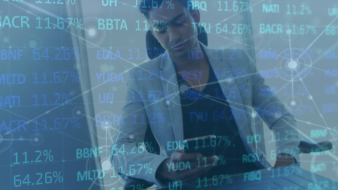 Business professional viewing a screen with connected lines and financial data figures overlayed, reflecting global stock market trends. Suitable for illustrating financial analysis, investment strategies, technology in business, and economic insights.