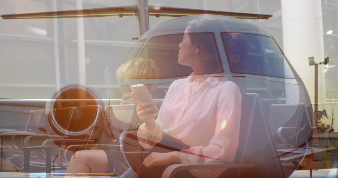 This visual blend showcases a professional woman holding a smartphone as she waits in an airport, with overlapping airplane details, symbolizing her anticipation and connection to travel. Ideal for use in business travel blogs, technology-focused presentations, or advertisements highlighting strategic logistics and business growth opportunities linked with global network and efforts toward digital innovation.