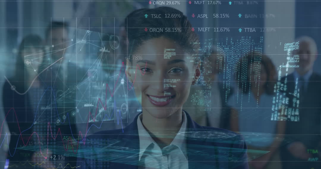 Business professional smiling with modern data analytics overlay featuring stock market statistics and charts. Ideal for illustrating concepts of finance, data analysis, innovation in business, and technology-driven workplaces. Suitable for use in advertisements or publications related to corporate finance, tech development, or economic growth.