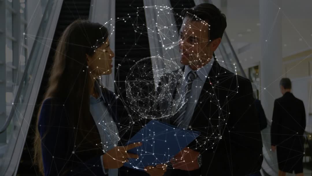 Business professionals stand adjacent to an escalator, deeply engaged in a strategic discussion. The scene captures a male in a formal suit holding a blue folder and speaking to a female colleague, potentially brainstorming ideas together. The digital network overlay in the foreground gives a sense of technology and innovation, symbolizing modern connectivity in the corporate world. Use this for themes surrounding corporate collaboration, technology-pitched business environments, or modern business networks.
