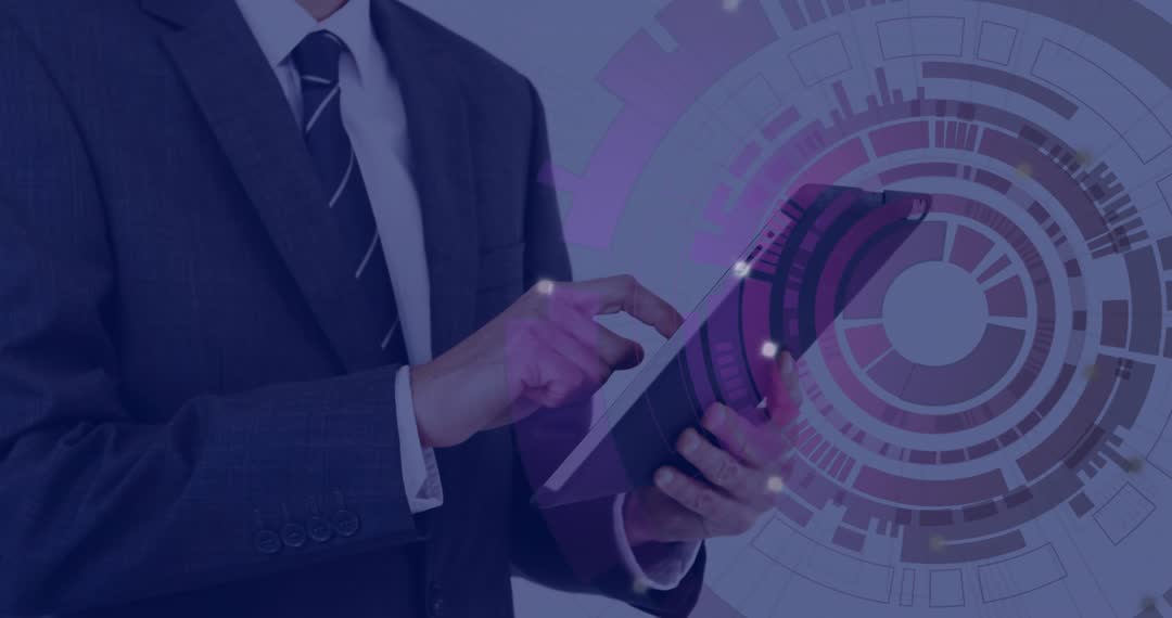Depicts businessperson interacting with tablet enhanced by digital data visualizations. Indicates how technology integrates in corporate environments, ideal for themes on digital transformation, business strategy, and analytics. Suitable for articles, presentations or marketing involving modern business technology integration and digital data analysis.