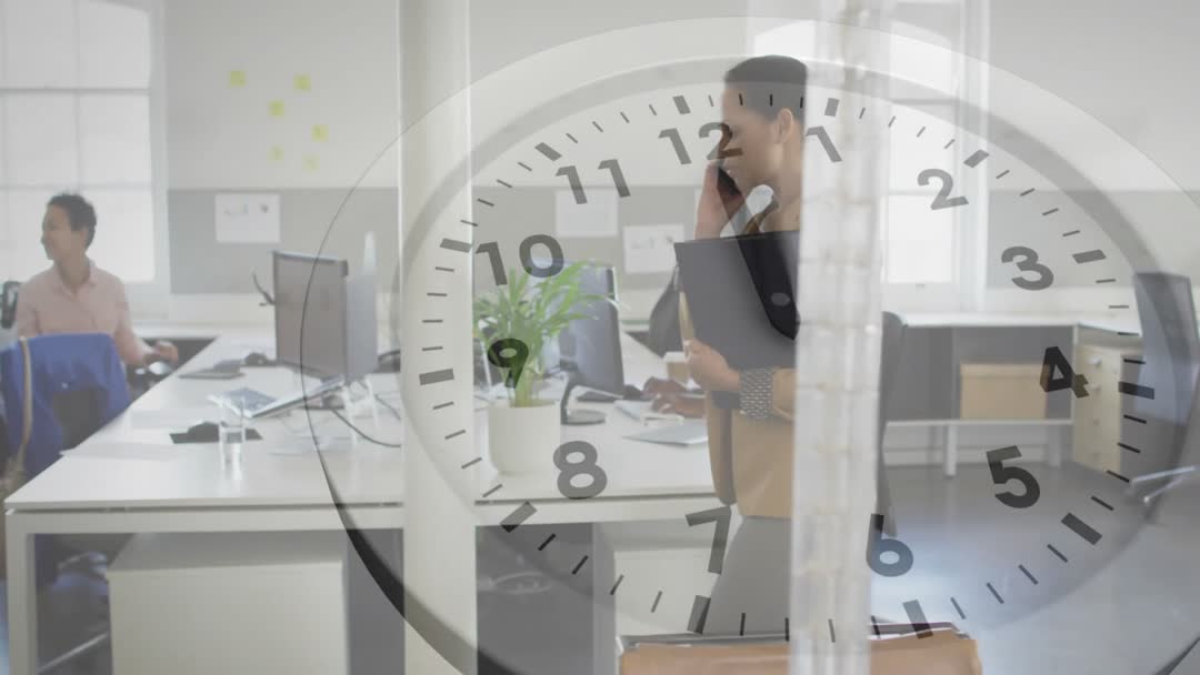 A business executive is multitasking in the office while talking on the phone, symbolizing effective time management in a dynamic corporate environment. The subtle overlay of a clock portrays the concept of using time efficiently and balancing multiple tasks. Ideal for illustrating themes of productivity, multitasking, corporate culture, or time management in marketing materials or corporate presentations.
