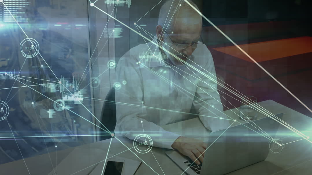 This intriguing scene features a professional intensely focused on a laptop, enveloped in a dynamic display of digital and network elements. Ideal for illustrating themes related to modern technology, digital network solutions, data analysis, and the tech-driven workplace. Perfect for blogs or articles covering innovation, internet connectivity, or professional development in tech.