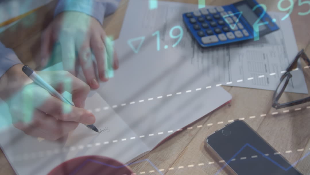 This video illustrates a business professional focused on taking notes while analyzing stock market data. Overlays of data charts reflect trends typically seen on stock market displays. This visual can be used in financial newsletters, business presentations, or educational content explaining investment analyses and strategies.