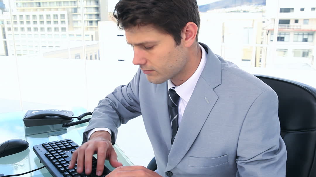 A businessman in a suit is working at his desk, typing on a keyboard in a modern office environment with a city view. This video can illustrate themes related to office work, professional environments, business activities, or corporate settings. It is suitable for promoting business services, corporate websites, or workplace-related articles.