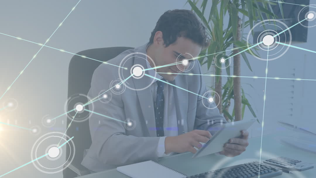 This video combines a business setting with digital networks, ideal for illustrating concepts related to technology, professional networking, and data analysis. Suitable for use in corporate presentations, tech blogs, or advertisements promoting innovative strategies and digital solutions.