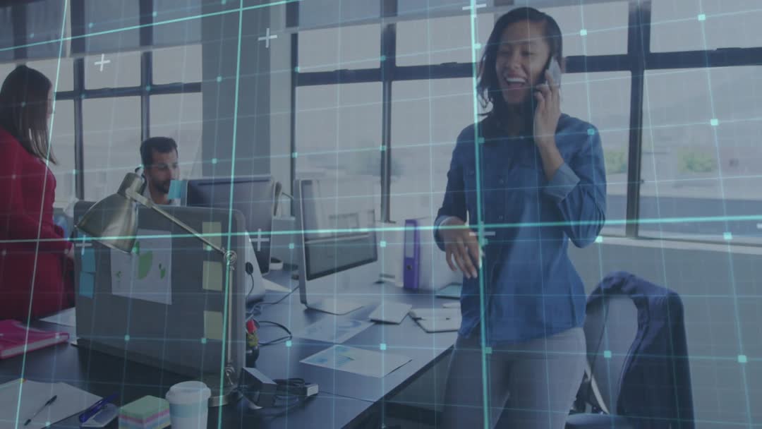 This video captures a business professional in an office using a mobile phone, with animated data lines on the computer screen. It conveys themes of communication, digital transformation, and modern business practices. Ideal for use in articles or presentations about business communication technologies or corporate work environments.