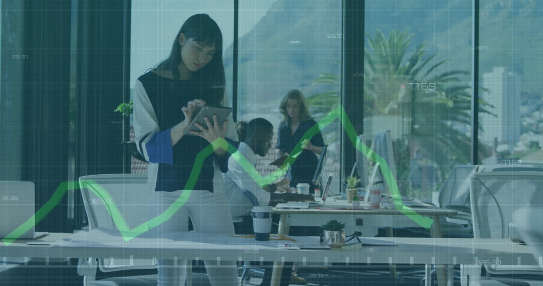 A businesswoman of biracial descent concentrates on a tablet amidst an open-concept office with large windows offering views of palm trees. Green graphs and digital data projects over the scene, suggesting a focus on financial analysis and global business connectivity. Perfect for illustrating technology in workplaces, remote work innovations or corporate financial services.