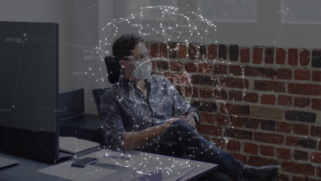 Caucasian businessman sits at desk with futuristic digital globe and data points around him, conveying the integration of technology into modern business practice amid COVID-19 precautions. Ideal for use in materials focusing on business technology, remote work, or pandemic-related office changes.