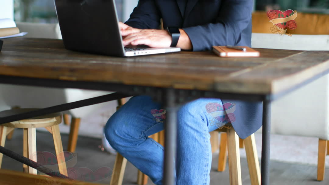 A business professional is seated at a rustic wooden desk, focusing on their laptop as animated hearts fall from above, adding a romantic touch to the setting. This video can be used for romantic business themes, digital marketing, Valentine’s Day promotions, product presentations involving human creativity and emotional connections, and can enhance presentations inviting warmth to business communications.
