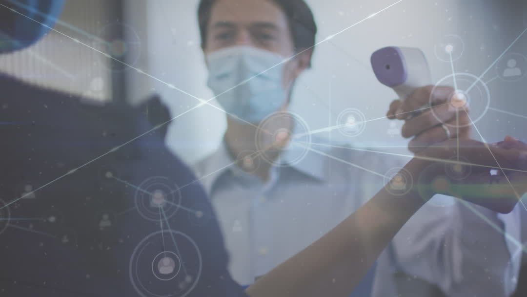 Visual representation of business professionals adapting to a digitally-connected office environment. Individuals wearing face masks participate in collaborative work through virtual networking technologies. Useful for illustrating modern workplace adaptations, highlighting safe business practices during a pandemic, and showcasing advancements in technology that promote remote collaboration.