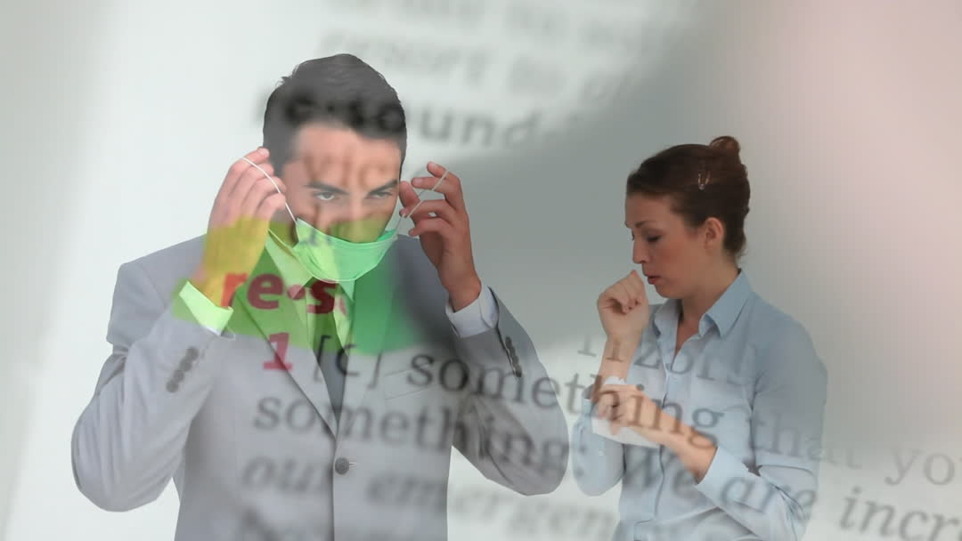 Animated visual depicting business professionals taking health precautions by wearing masks, ideal for illustrating safety guidelines during health crises in office environments. This can be used in presentations, articles, and digital media to emphasize the importance of workplace safety and adapting to global health challenges.