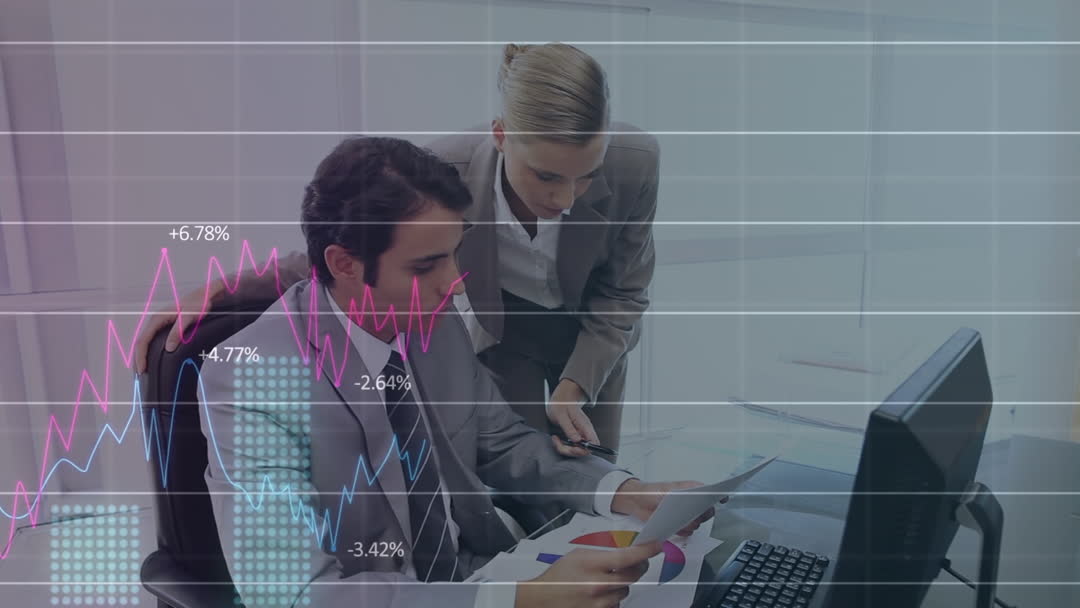 This video depicts business professionals engaged in analyzing data trends at an office desk, showcasing collaboration in a corporate environment. The graphical overlays highlight financial or market analytics, making it ideal for use in presentations about business strategy, financial services, tech startups, or teamwork in data-driven environments.