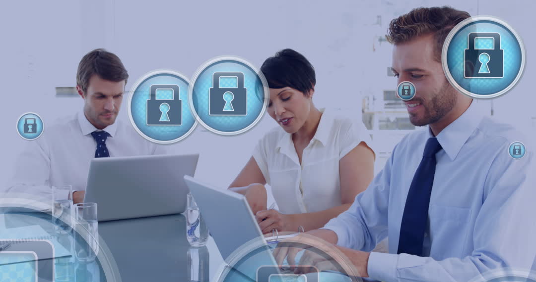 In an office setting, professionals focus on laptops while digital padlock symbols overlay video, representing cybersecurity. Useful for illustrating concepts of data protection, IT security strategies, or corporate technology workshops. Ideal for blog posts, presentations, or marketing materials about information security and professional teamwork.