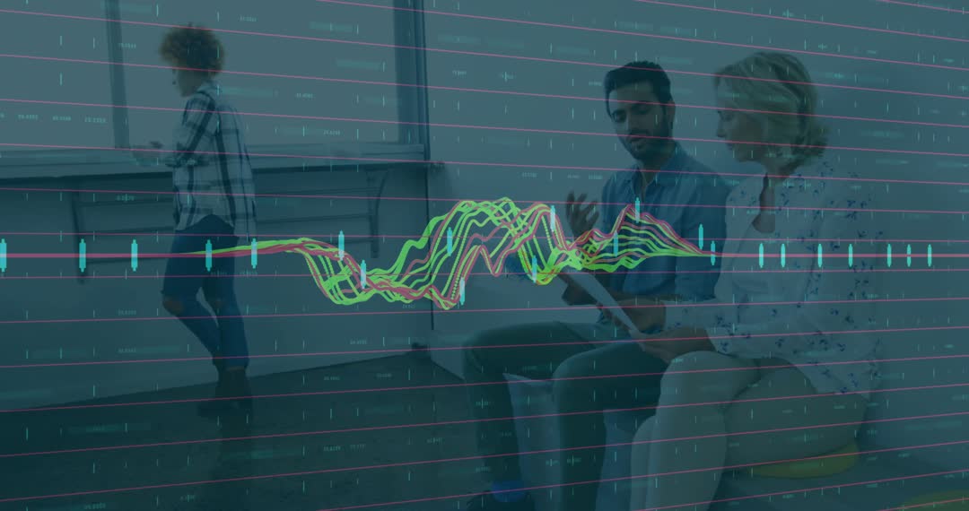 This portrays professionals engaged in data analysis with a digital waveform overlay. Use for technology, modern business communication, and advanced data analytics themes. Suitable for illustrating corporate teamwork, visualizing financial analytics, or promoting tech-driven productivity.