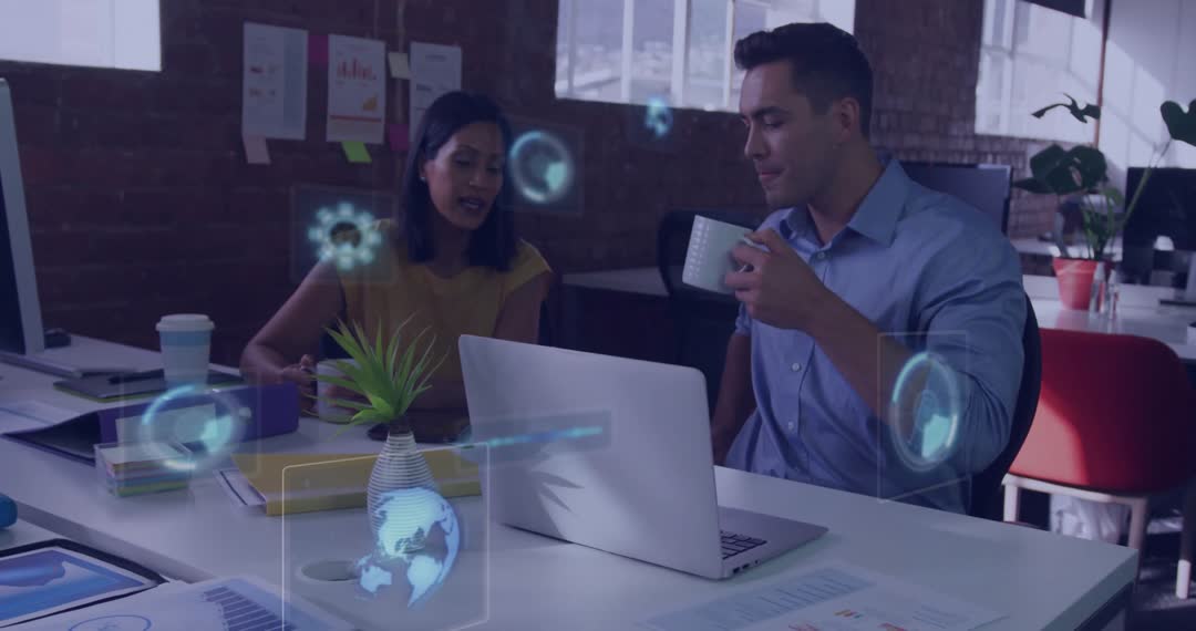 Two business professionals engage in discussion at a desk, examining overlaid digital data animations exemplifying innovation and modern technology application. Used for promoting technology-driven strategies, enhancing collaborative teamwork dynamics, and visualizing data analysis aspects in professional environments.
