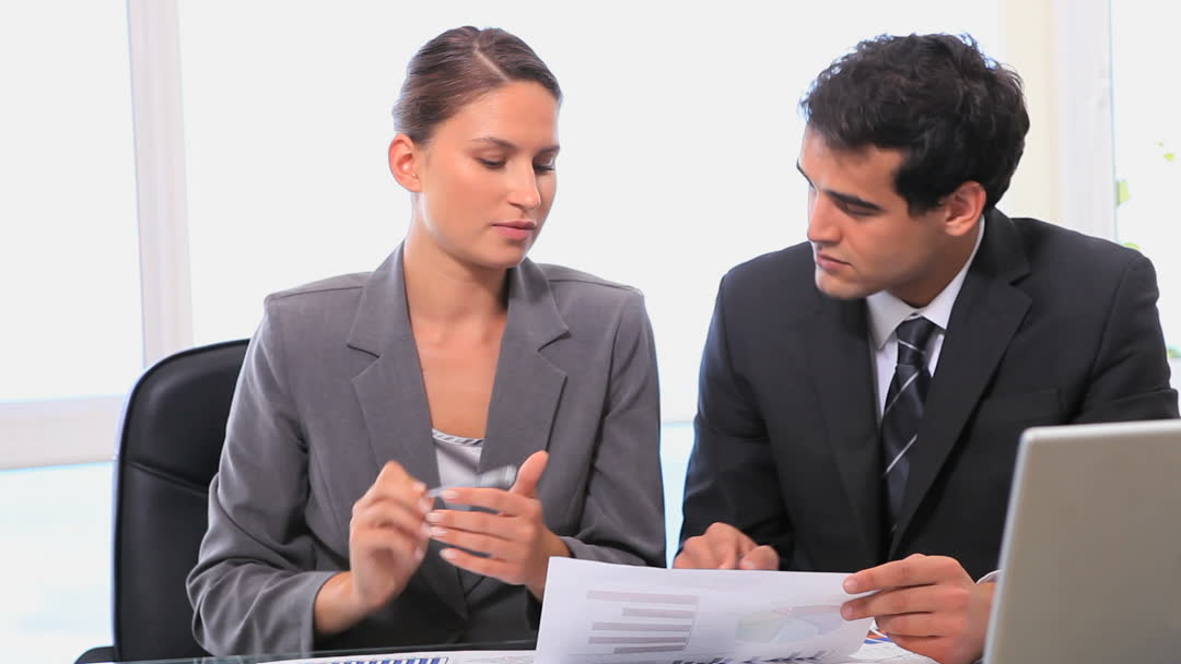 Two business professionals in formal attire are closely examining documents, suggesting a collaborative work environment. This video is ideal for illustrating concepts related to teamwork, business strategies, corporate meetings, and office productivity. It can be used in business-related articles, corporate presentations, and promotional material highlighting professional services.