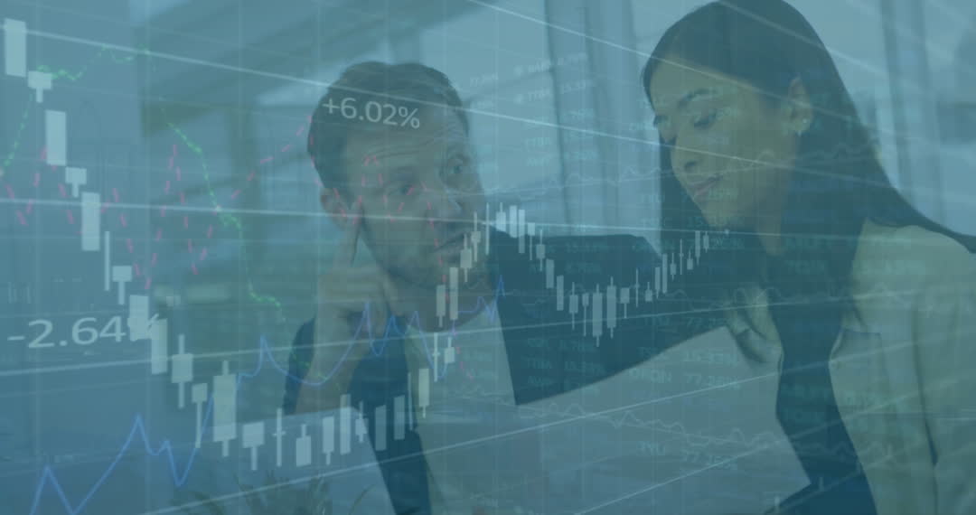 Two business professionals having an animated discussion over financial documents in a modern office environment. Superimposed data charts depict analytical conversations about statistics and growth strategies. Useful for articles on finance, reports on business teamwork, or materials conveying market analysis planning and strategy.