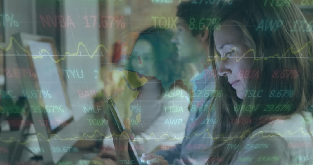Depicts business professionals analyzing stock market trends and financial data in an office setting. Digital overlays represent global stock prices and market activity, showing a high-tech work environment. Useful for articles or presentations on financial markets, technological advancements in finance, and professional workplace settings.