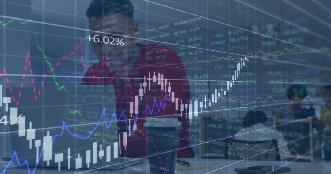 Blending financial charts with office scenery, this video suggests professionals analyzing market trends and growth. An excellent visual for business and finance articles, presentations on data development, or advertisements targeting financial consultancy and investment sectors.