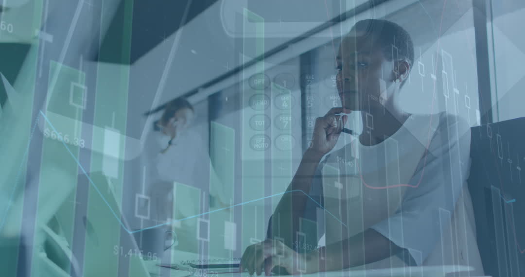 Visual representing business professionals working in a contemporary office while analyzing financial data through digital networks and graphs. Ideal for illustrating concepts of finance, technology-driven workplaces, investment analysis, and global business connections in promotional materials or finance-related content.