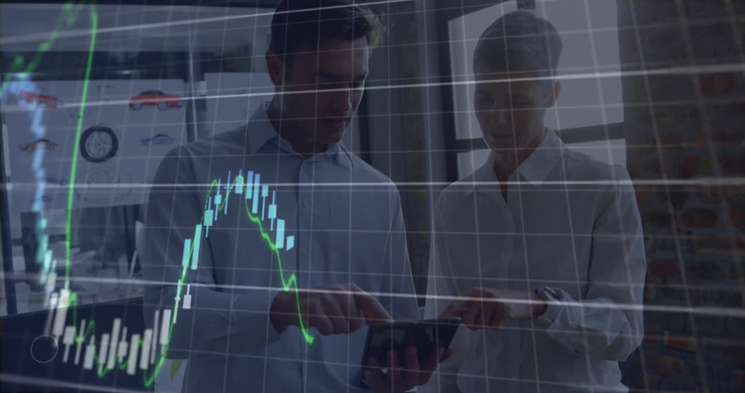 Business professionals in modern workplace analyzing digital financial data projections displayed in the scene. The dynamic overlay of stock market graphics conveys an environment of investment and strategic planning. Suitable for illustrating concepts of market analysis, corporate strategy, and financial technologies. Can be used for business presentations or educational materials related to finance and economics.
