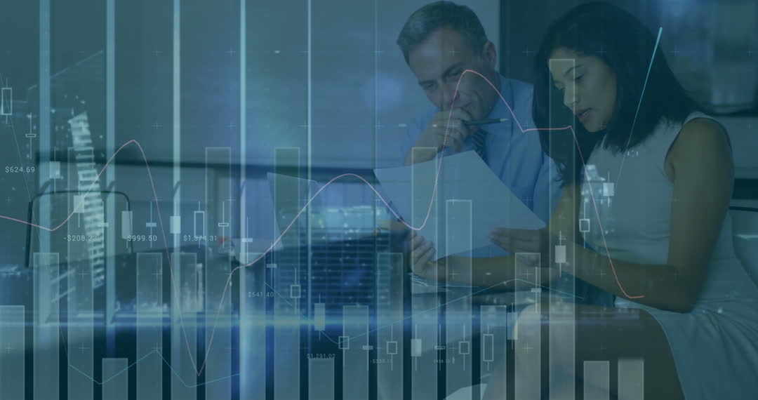 Man and woman examining documents associated with stock market graphs displayed in background convey financial business environment. Useful for depicting subjects related to corporate finance, investments, stock trading strategies, and general economic analysis.