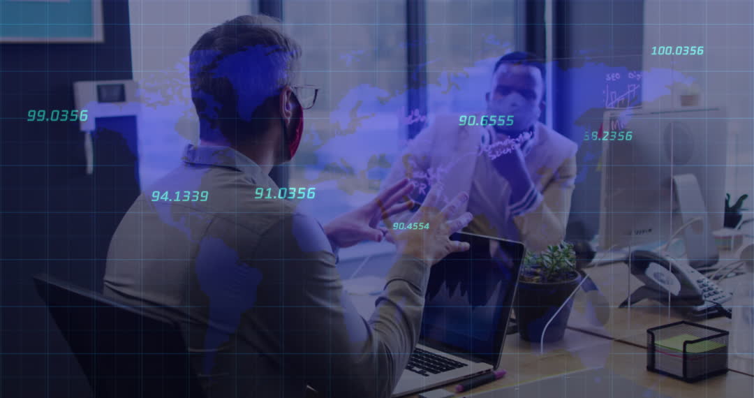 Business professionals are collaborating in an office with a virtual overlay of financial data and numbers, symbolizing analytical strategy and modern technology in global business operations. Ideal for illustrating concepts related to finance, data analysis, teamwork, innovative business solutions, and digital transformation in workplaces.