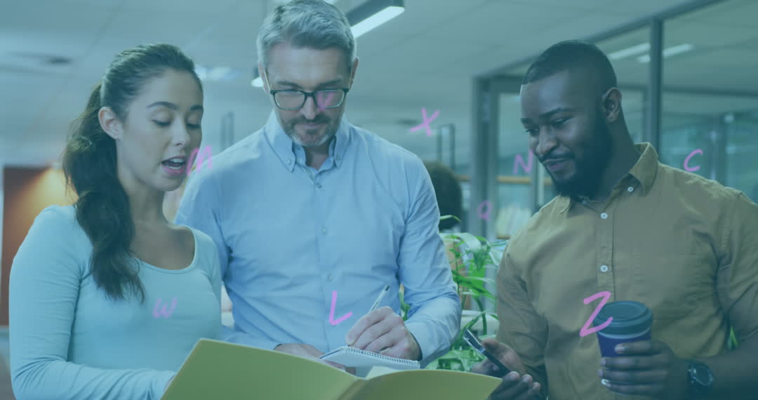 Group of business professionals standing together in an office setting, discussing data-driven insights and future business trends. Letters and animated graphics create a futuristic technology effect, reflecting teamwork and innovation. Perfect for materials focusing on corporate innovation, team dynamics, future technology integration, and business strategy.