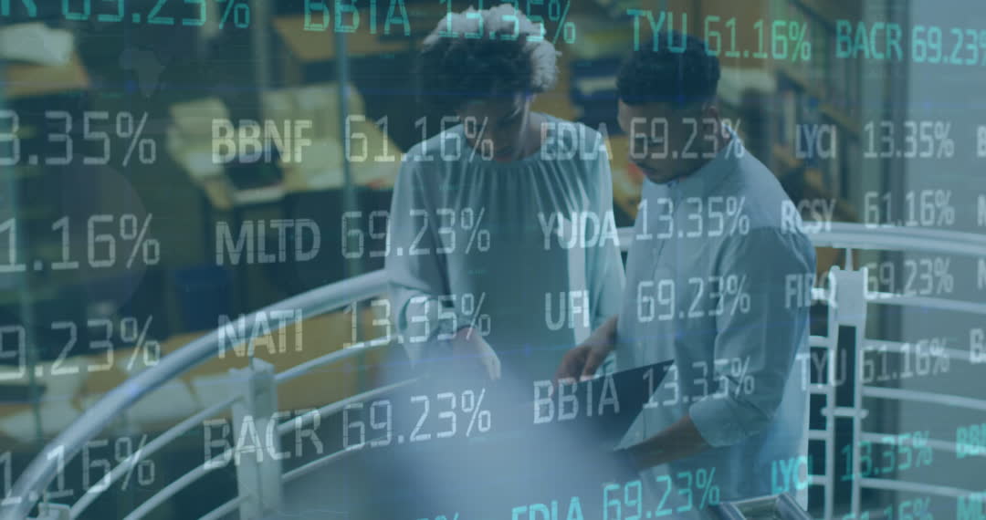 Business professionals collaboratively reviewing digital financial data, with overlaid stock market trends indicating their focus on efficient workflow and informed decision-making. Ideal for showcasing teamwork, finance strategy, and technology integration in modern business settings. Useful for articles on cooperation and productivity in financial sectors.