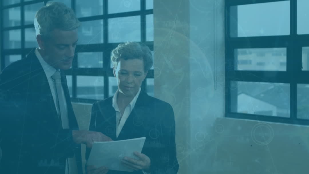Business professionals reviewing document with global tech icons superimposed, symbolizing worldwide financial connectivity. Ideal for illustrating topics on international business connections, financial markets, technological advancements, and global economic strategies in presentations or articles.