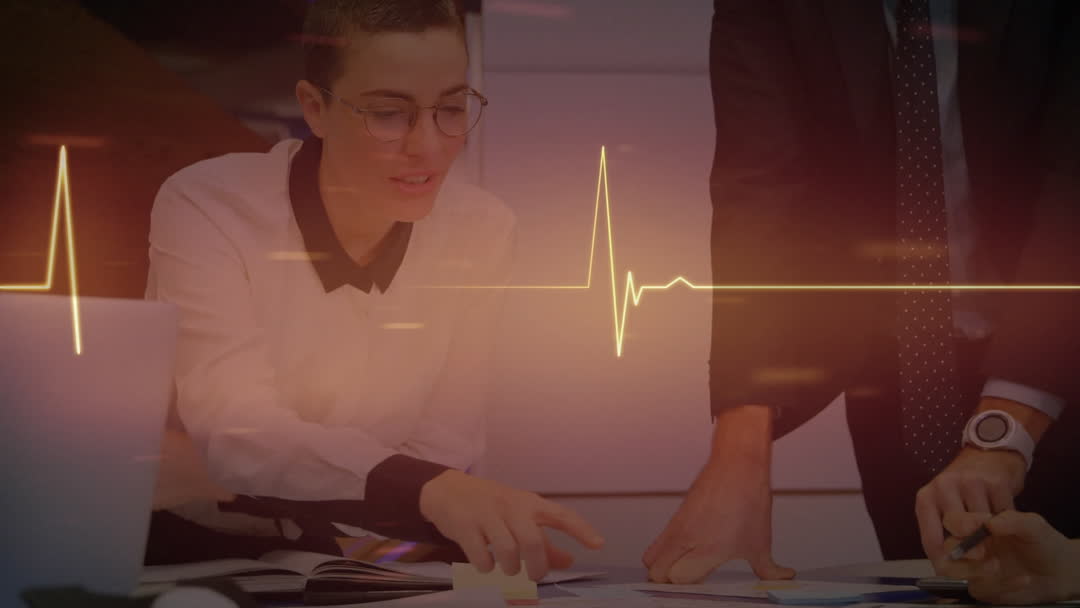 Business professionals are engaged in a strategic discussion while reviewing documents in a conference room. The presence of an orange ECG heartbeat line adds a healthcare or medical theme to the scene, possibly symbolizing vitality or urgency. This video might be used to illustrate concepts of business dynamics, health sector industry, teamwork, or the impact of health on productivity in professional settings.