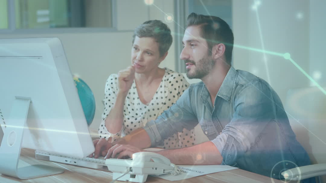 Two business professionals are collaborating in an office setting, focusing intently on a computer screen. Overlaid videos suggest global connections and data processing. Ideal for illustrating corporate modernity and digital teamwork. Useful for websites, presentations, or articles about business technology and innovations.