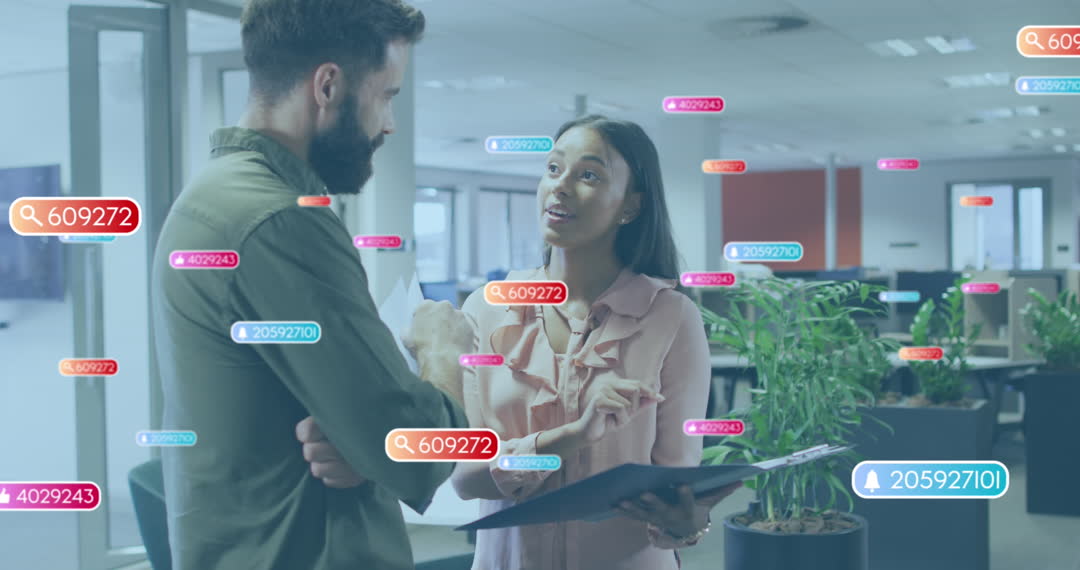 Two diverse business professionals engaged in animated conversation, complemented by digital effects showing social media engagement metrics, symbolizing the intersection of technology and modern work trends. This visual is ideal for presentations on digital marketing strategies, articles about social media analytics, or content about teamwork and innovation in the workplace environment.