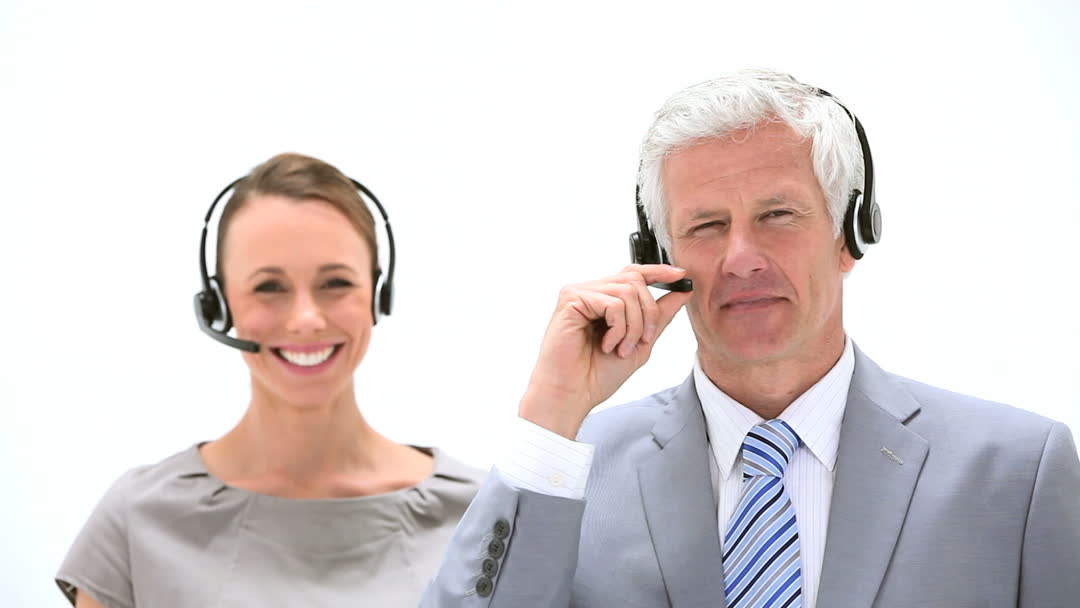 The video shows a pair of business professionals using headsets against a plain white background, symbolizing communication, teamwork, and online engagement. This is ideal for use in advertising corporate customer service, illustrating business communication technology or promoting headset devices in a professional setting.