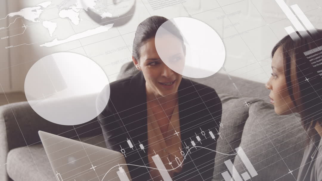 Two business professionals engaged in discussion with overlay of data analytics and global maps. This concept represents modern business strategies, financial analysis, and global market insights. Ideal for corporate presentations, business strategy workshops, and digital marketing materials illustrating teamwork and data-driven decision-making.