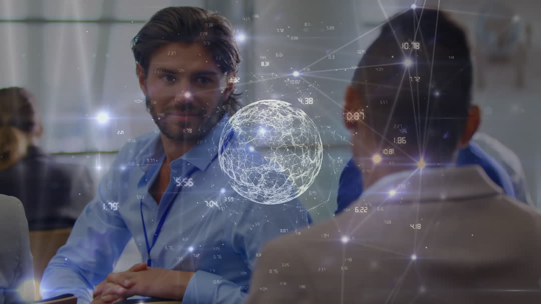 Business professionals engaging in a dynamic conversation overlaid with a digital globe and data, representing innovation and technology in modern business environments. Useful for illustrating global business discussions, data-driven innovation, teamwork, and future-focused collaborations.