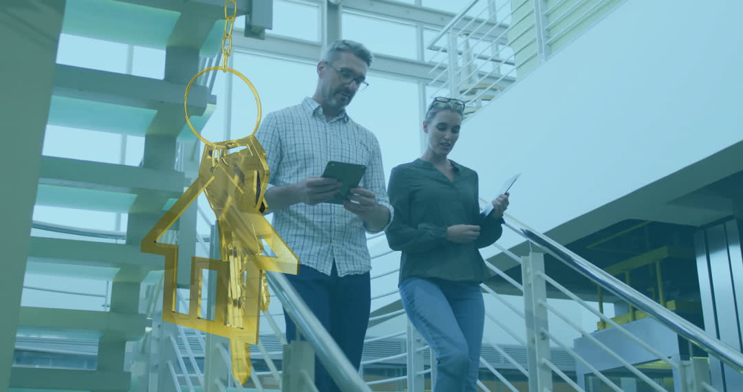 Business professionals using digital devices while descending stairs accompanied by an animation of a gold house key. Represents concepts like property ownership, real estate dealings, global mortgage strategies. Suitable for advertisements related to digital mortgage applications, real estate technology, business consultations and collaborative finance solutions.