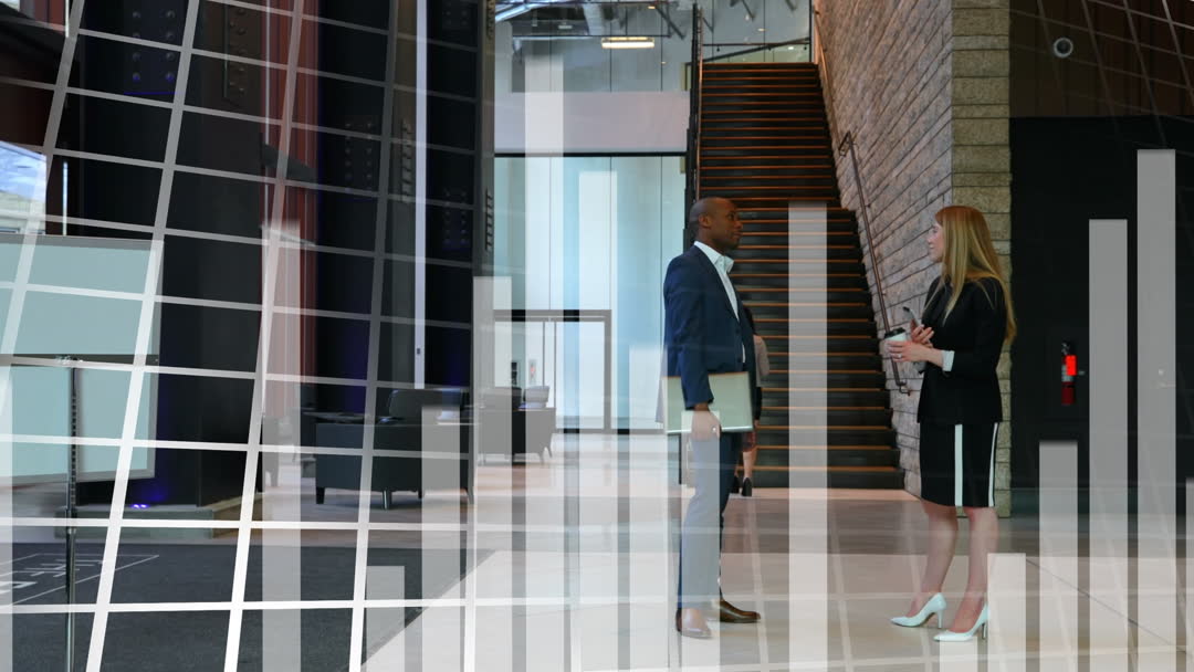 Two business professionals engage in conversation within a modernized office setting featuring media elements like data or technology overlays. This context communicates a theme of corporate interaction, professionalism, and modern business practices within an urban space. Moreover, it evokes ideas of teamwork, office life, and analytic collaboration within sterile corporate communications. It is well-suited for creating content on professionalism, urban business contexts, and contemporary business analytics techniques.