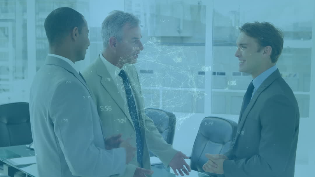 Group of businessmen in formal attire engaging in conversation, set in modern office environment. Overlay of digital network and numerical graphics in background suggests discussion about global finance or tech strategies, enhancing theme of future-focused leadership. Useful for representing corporate collaborations, modern business practices, tech-driven discussions, or futuristic office settings.