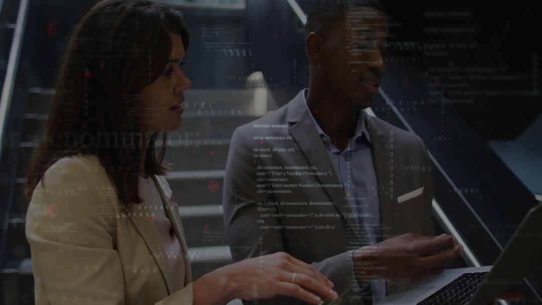 Two business professionals are discussing work while standing on a staircase, with digital coding interface overlay throughout the scene. This visual juxtaposition suggests innovation and the integration of technology into business environments. The video can be used to illustrate concepts of digital transformation, teamwork in tech-driven industries, and modern office practices.