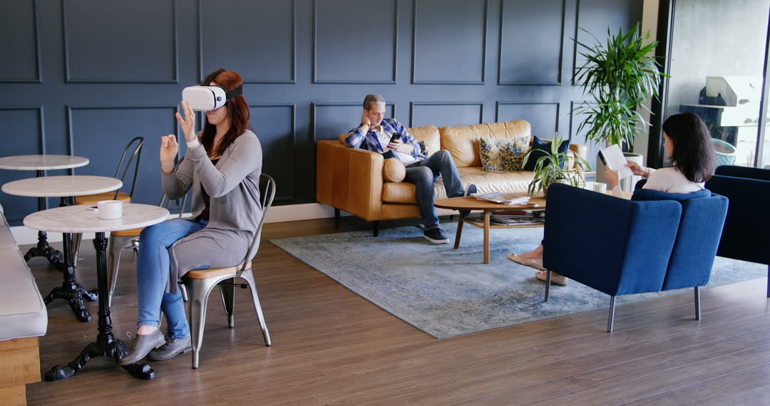 Depicts professionals in modern office lobby embracing technology such as virtual reality while engaging in other activities like using mobile phones and reading. Ideal for illustrating concepts of digital innovation, contemporary workspaces, and the integration of technology in professional settings.