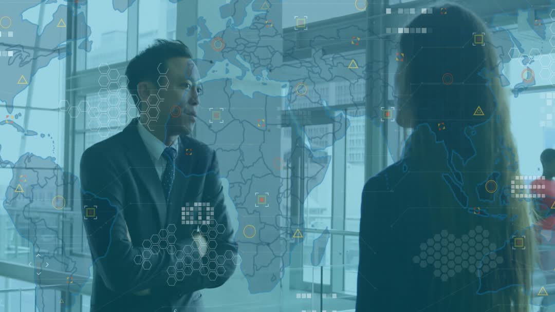 Businessman and businesswoman talking in lobby with modern world map and data visualization overlay. Ideal for showcasing corporate collaboration, strategic planning, and networking. Useful for content focusing on global technology, innovation in business, or corporate strategy development.