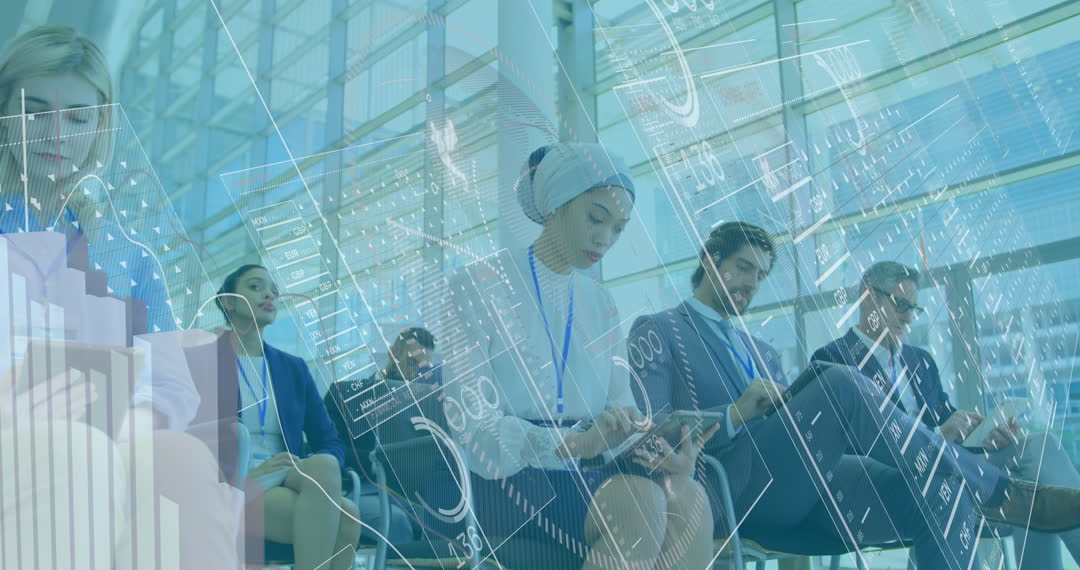 Business professionals are seated with digital tablets, displaying engagement with global finance concepts. Enhanced with a digitally generated finance interface overlaying the scene, this visual represents the integration of technology in corporate settings. Useful for illustrating innovation in business, digital finance concepts, or tech-savvy corporate environments.