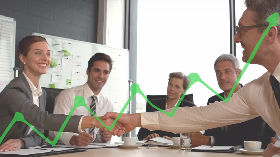 - Business Professionals Handshake Success in Office with Graph Overlay