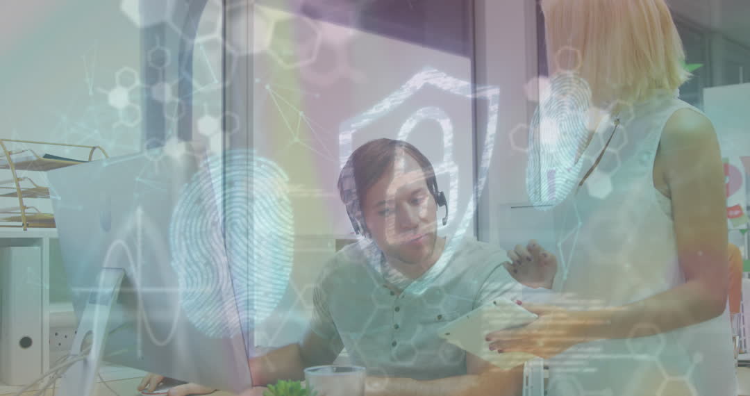 This conceptual video showcases a futuristic digital overlay featuring padlocks and data symbols, suggesting themes of cybersecurity and digital innovation. It highlights collaboration among business professionals in an office environment, focusing on data security and advanced technology. Ideal for use in articles, presentations, and banners discussing modern business, technology advancements, workplace collaboration, or cybersecurity trends.