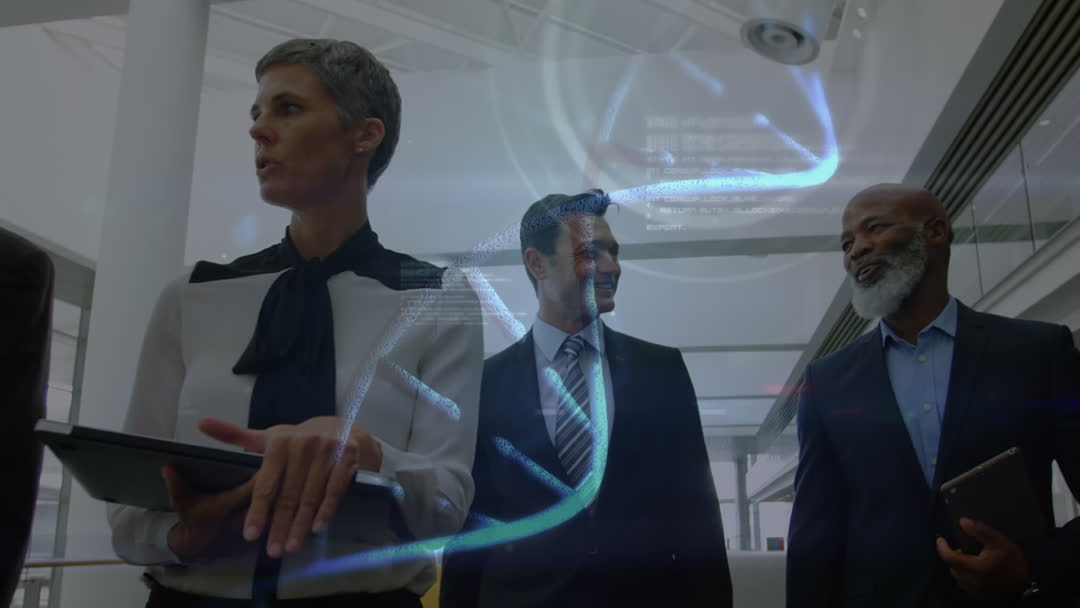 Depicts business professionals actively engaged in a high-tech work environment. Featured DNA strands and digital networks suggest innovation and advanced tech themes. Useful for illustrating concepts of fintech, biotechnology integration, corporate strategy planning, or futuristic business operations.