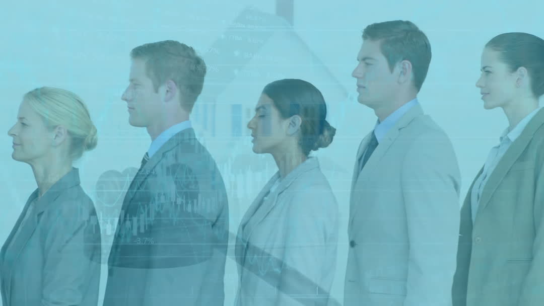 This video shows a group of business professionals standing in a line, overlaid with digital data graphics symbolizing the global economy and technological connections. It illustrates themes of collaboration and innovation in the business world. Ideal for use in corporate materials, technology presentations, and content focusing on economic trends and business networking.