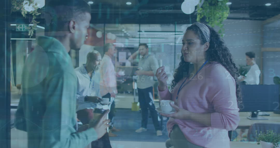 Business professionals engaged in conversation in a modern office space. There is a digital overlay of financial data, signifying a connection between interpersonal interactions and data analysis. Useful for illustrating finance, technology integration, business networking, and collaborative office environments. Ideal for use in articles about digital transformation, workplace efficiency, and contemporary office settings.